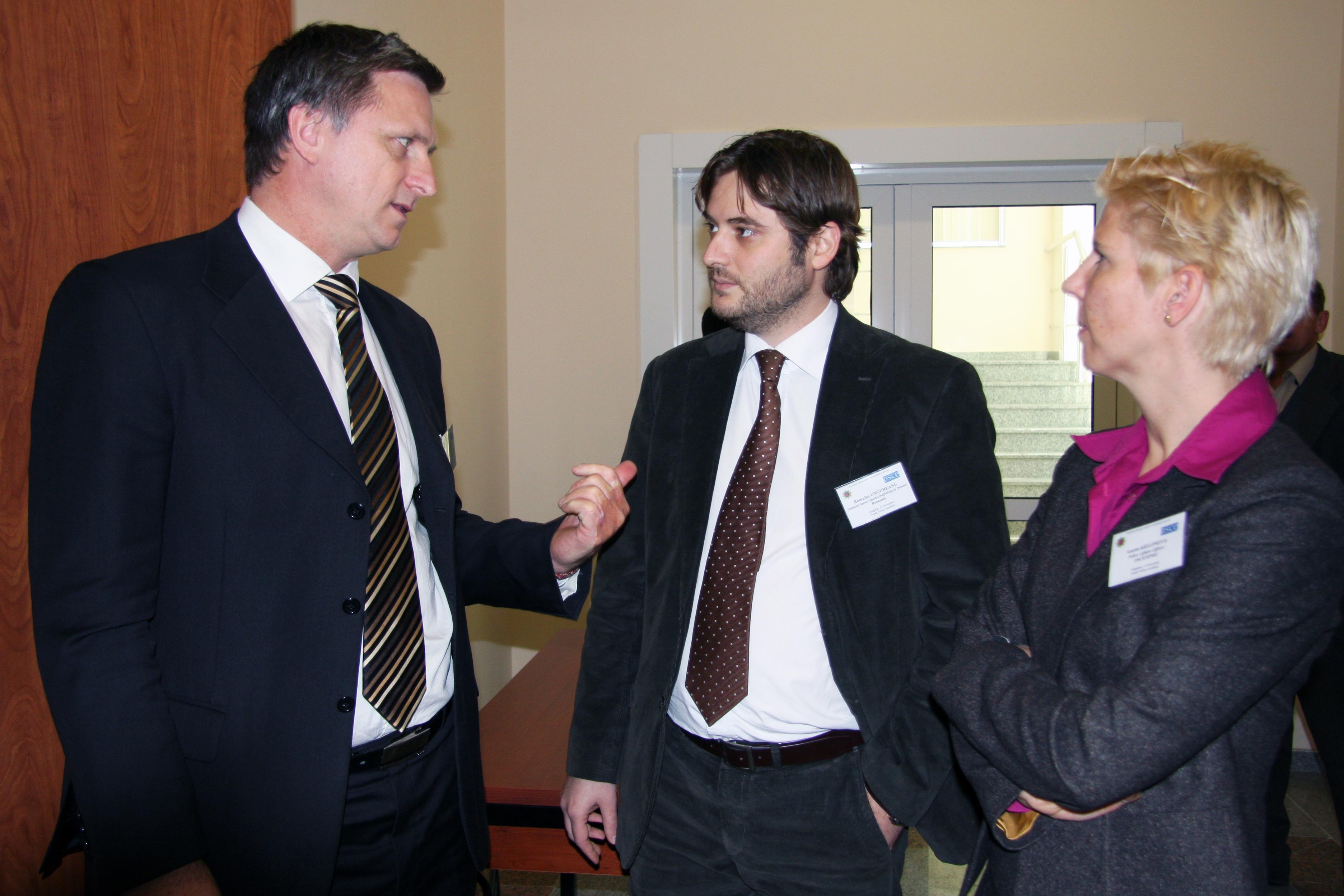 L-r: Knut Brattvik of Interpol, Romulus Ungureanu, president of the Romanian agency against trafficking in persons, and OSCE police affairs officer Anette Keloneva at an anti-trafficking seminar for law-enforcement bodies, Ashgabat, 12 November 2009.