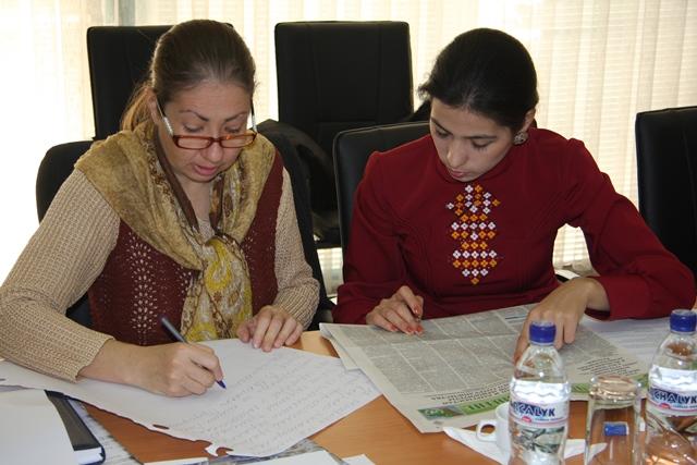 Participants during a group exercise on editing newspaper texts held as part of an OSCE Centre-organized training course on journalism writing and editing skills, Ashgabat, 13 November 2014.