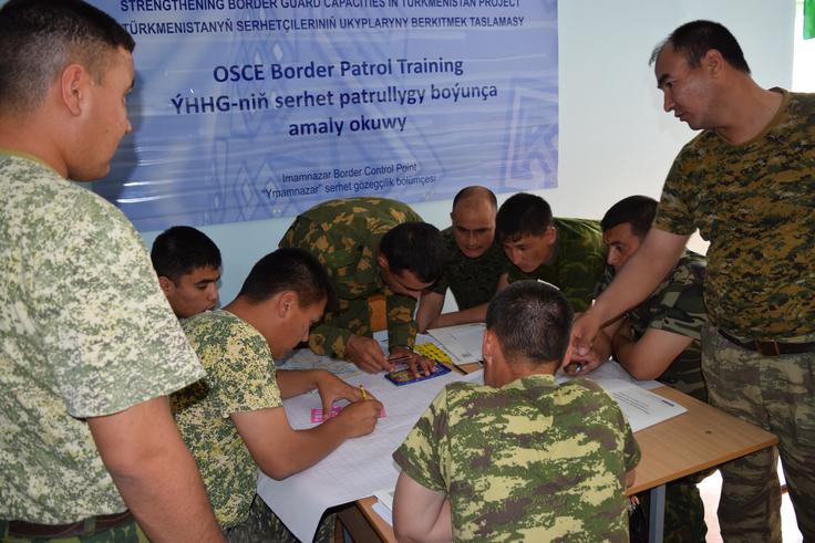 Turkmen border guards participate in a classroom mapping exercise during an OSCE-organized training course on border management and threat assessment at the Imamnazar border checkpoint on the Turkmen-Afghan border, 24 April 2015.