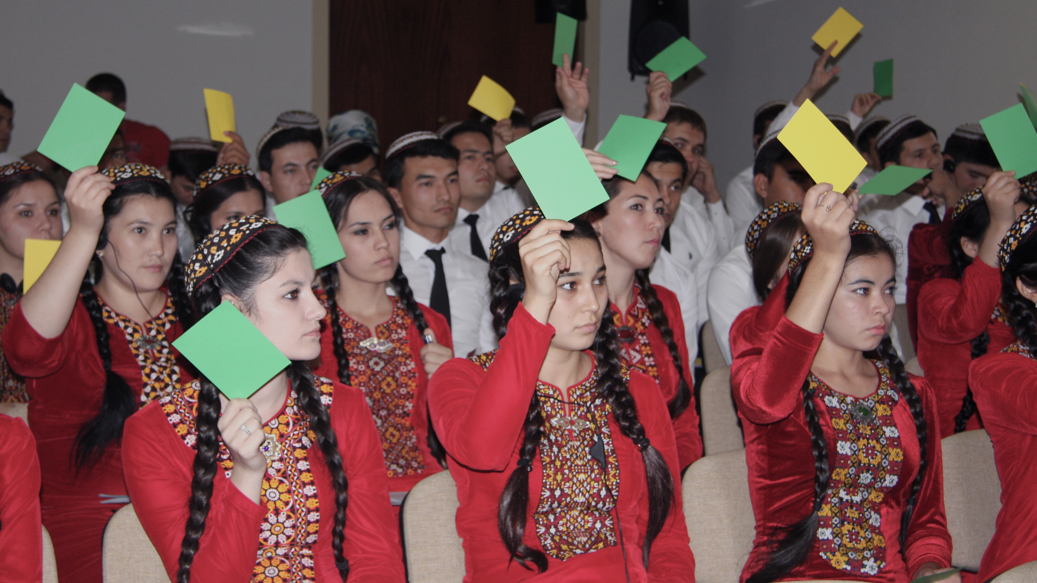 Students from the Institute of International Relations of Turkmenistan’s Foreign Ministry and the International University for Humanities and Development show cards in response to questions asked by a lecturer during the OSCE-organized course on preventive diplomacy and negotiation in a neutral state, Ashgabat, 22 September 2015.