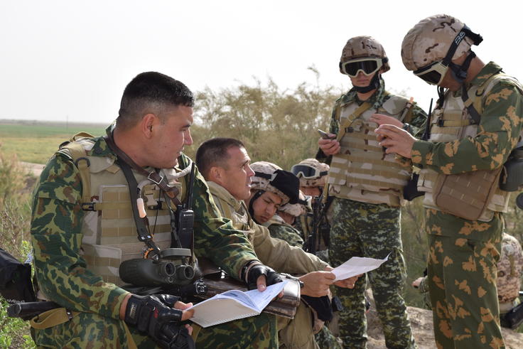 Border guards from Turkmenistan participate in a topographical reconnaissance exercise during an OSCE-organized training course on border management and threat assessment at the Imamnazar border checkpoint on the Turkmen-Afghan border, 24 April 2015.