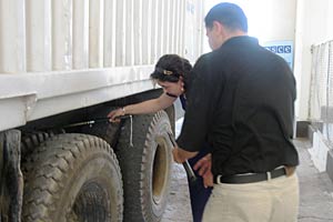 Participants check the tyres of a truck during an OSCE-organized one-week training course for customs officers on examination and detection techniques and protection of evidence, Dashoguz, northern Turkmenistan, 25 June 2010.