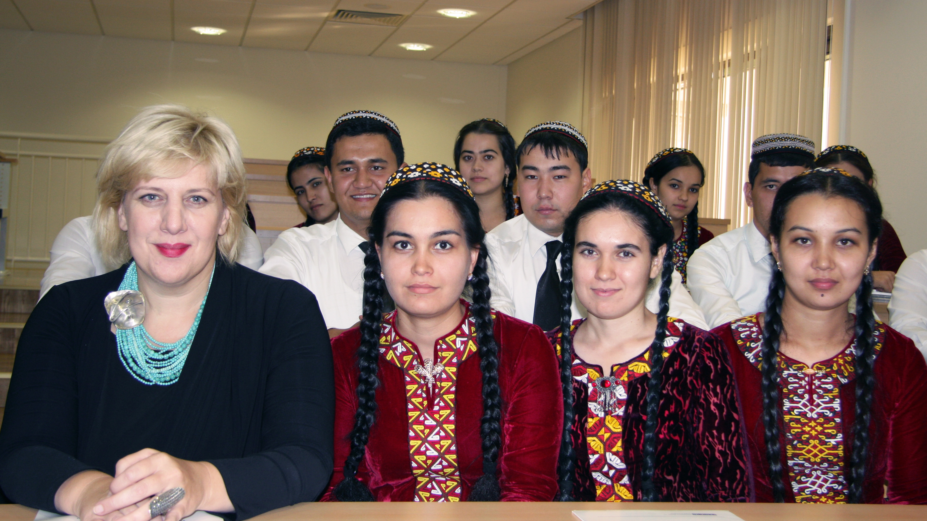 OSCE Representative on Freedom of the Media, Dunja Mijatović, with journalism students after a lecture on the activities of her office, at the Institute of International Relations, part of the Ministry of Foreign Affairs of Turkmenistan, Ashgabat, 19 September 2011.