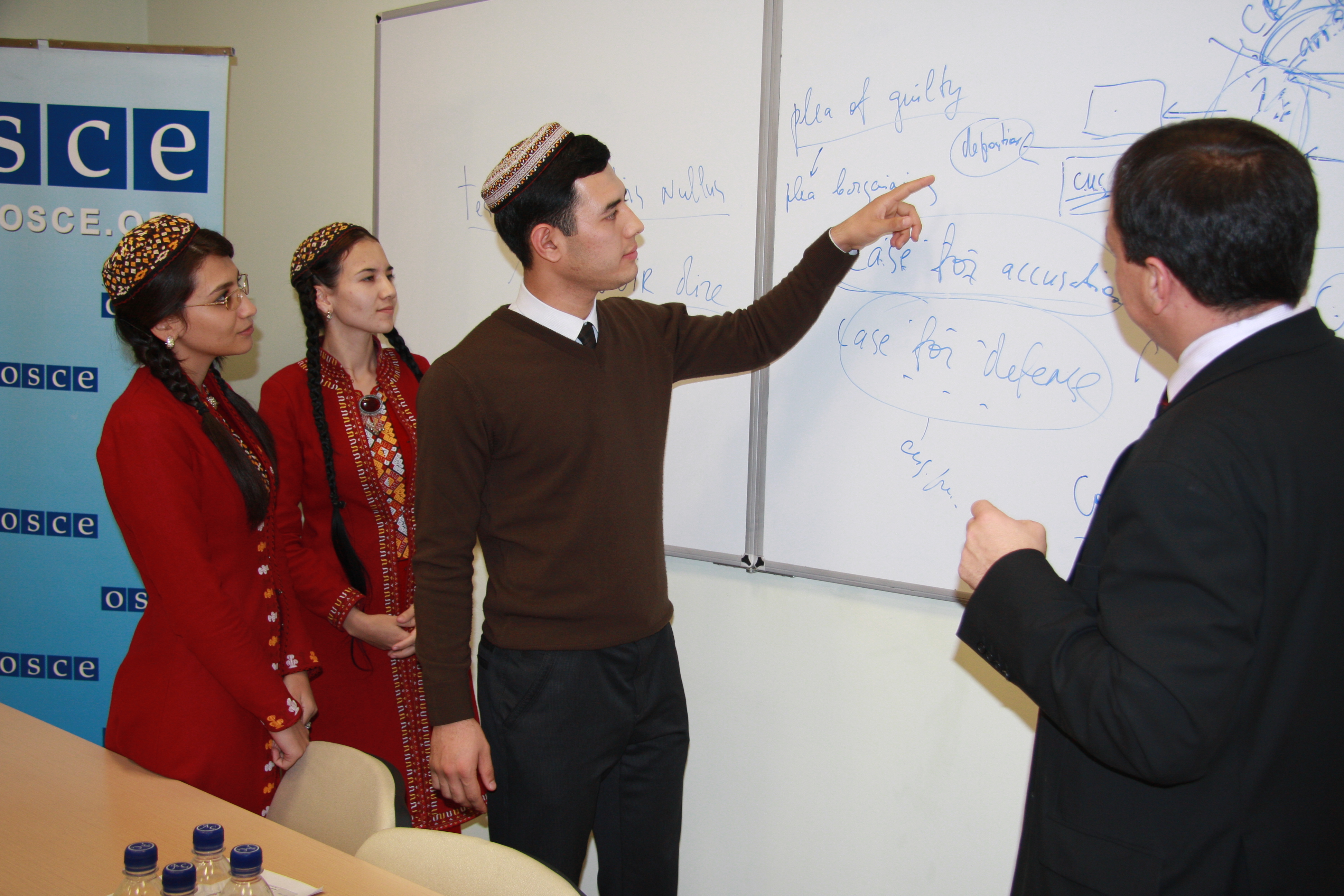 Leonid Golovko (r), a Professor at the Law Faculty of Moscow State University, answers questions asked by law students during an OSCE-organized lecture at Magtymguly Turkmen State University, Ashgabat, 24 November 2011.