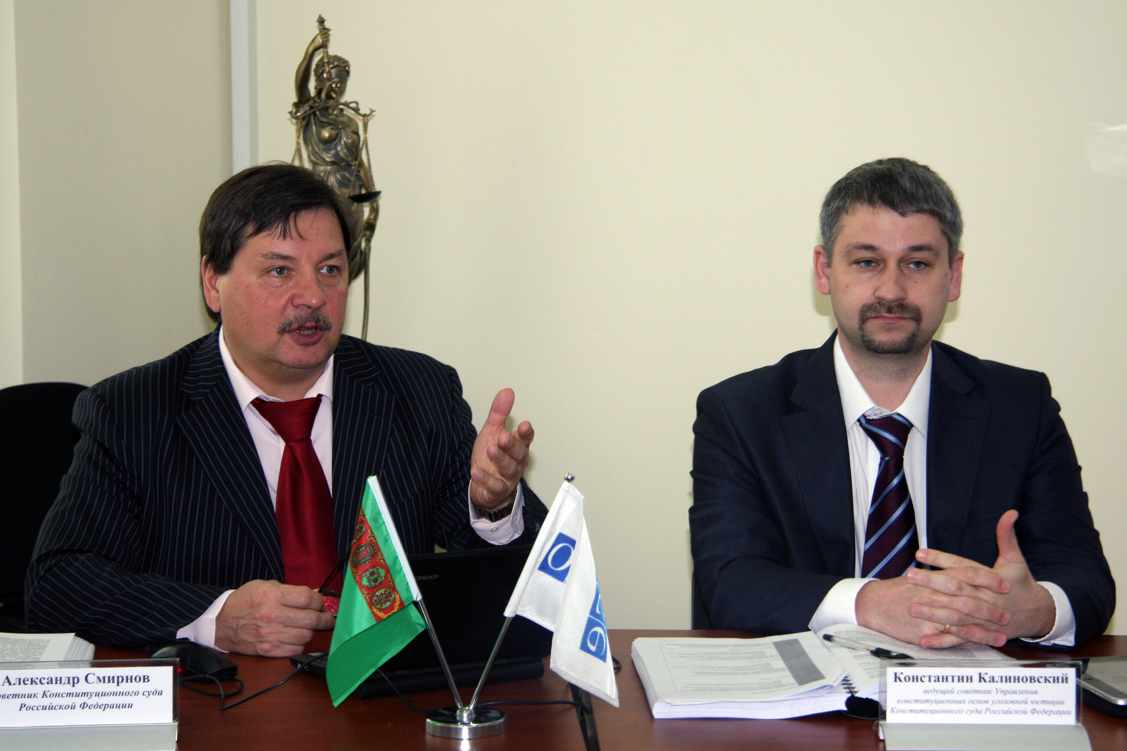 International experts Aleksandr Smirnov (l), and Konstantin Kalinovskiy, Counselors of the Constitutional Court of the Russian Federation, during an OSCE-organized lecture on human rights standards at the pre-trial stages of criminal proceedings, Ashgabat, 26 April 2012.