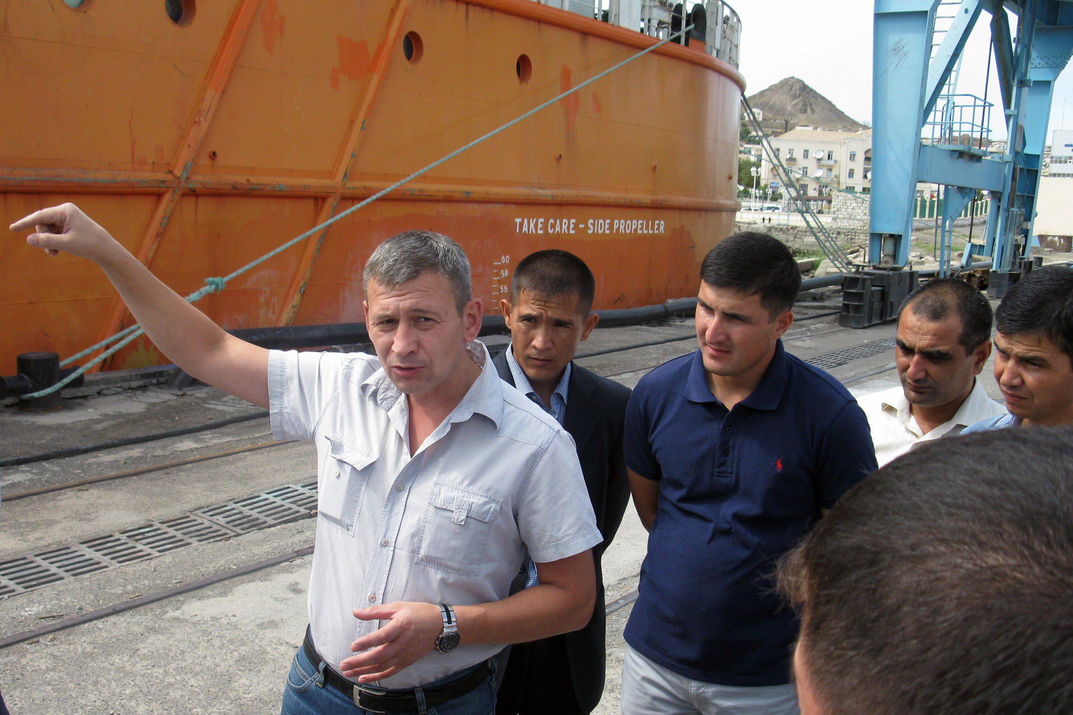 A Russian expert Vadim Emeliyanov and training participants during a site visit to the Turkmenbashi international seaport organized as part of the OSCE-supported training course on maritime border patrolling and surveillance methods, Turkmenbashi, 12 September 2012.