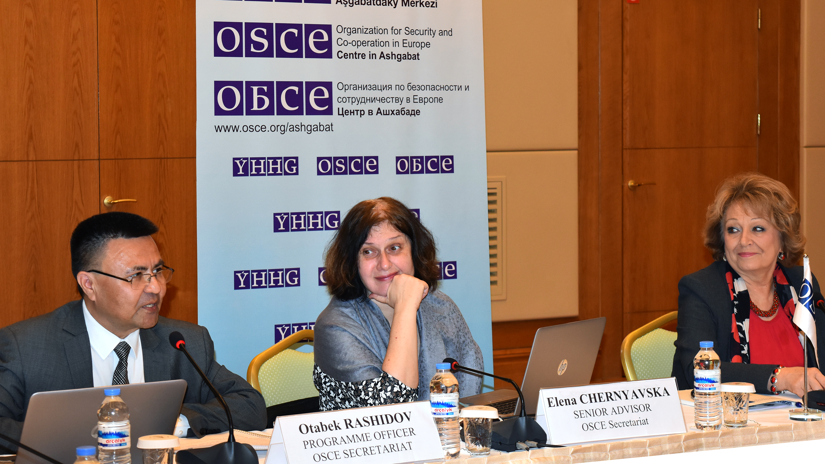 Otabek Rashidov (l), Programme Officer of the OSCE Transnational Threats Department, providing about 40 participants with the seminar overview during the opening session, Ashgabat, 5 April 2018.