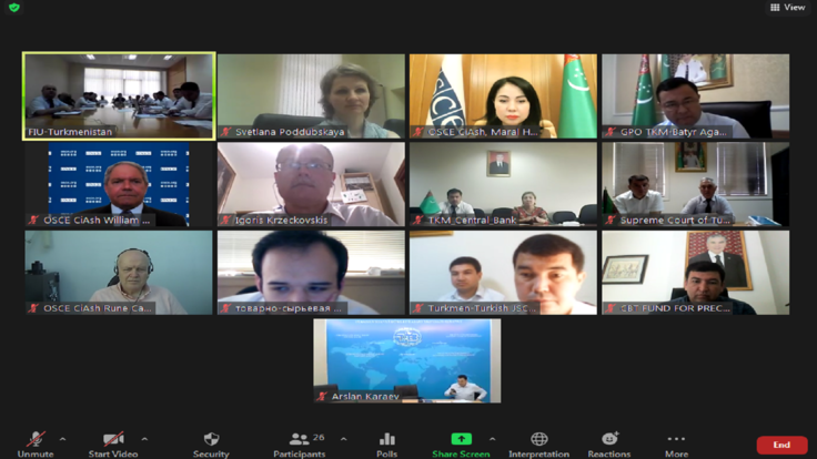 Participants during an online seminar on promoting best practices to combat money laundering and terrorist financing in Turkmenistan, Ashgabat, 2 August 2021.