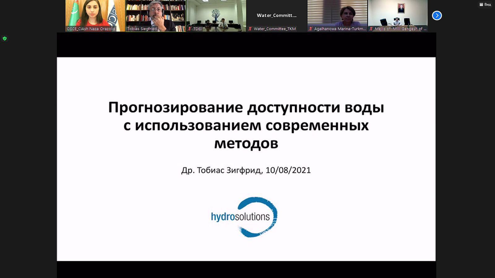 Presentation on Forecasting water availability using modern methods, held by Dr. Tobias Siegfrid, an international expert from Switzerland, during an OSCE-organized online seminar on international experience on implementing digital technologies in water industry, 10 August 2021.