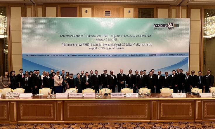 Participants at the conference to mark 30 years of co-operation between the OSCE and Turkmenistan, held in Ashgabat on 7 July 2022.