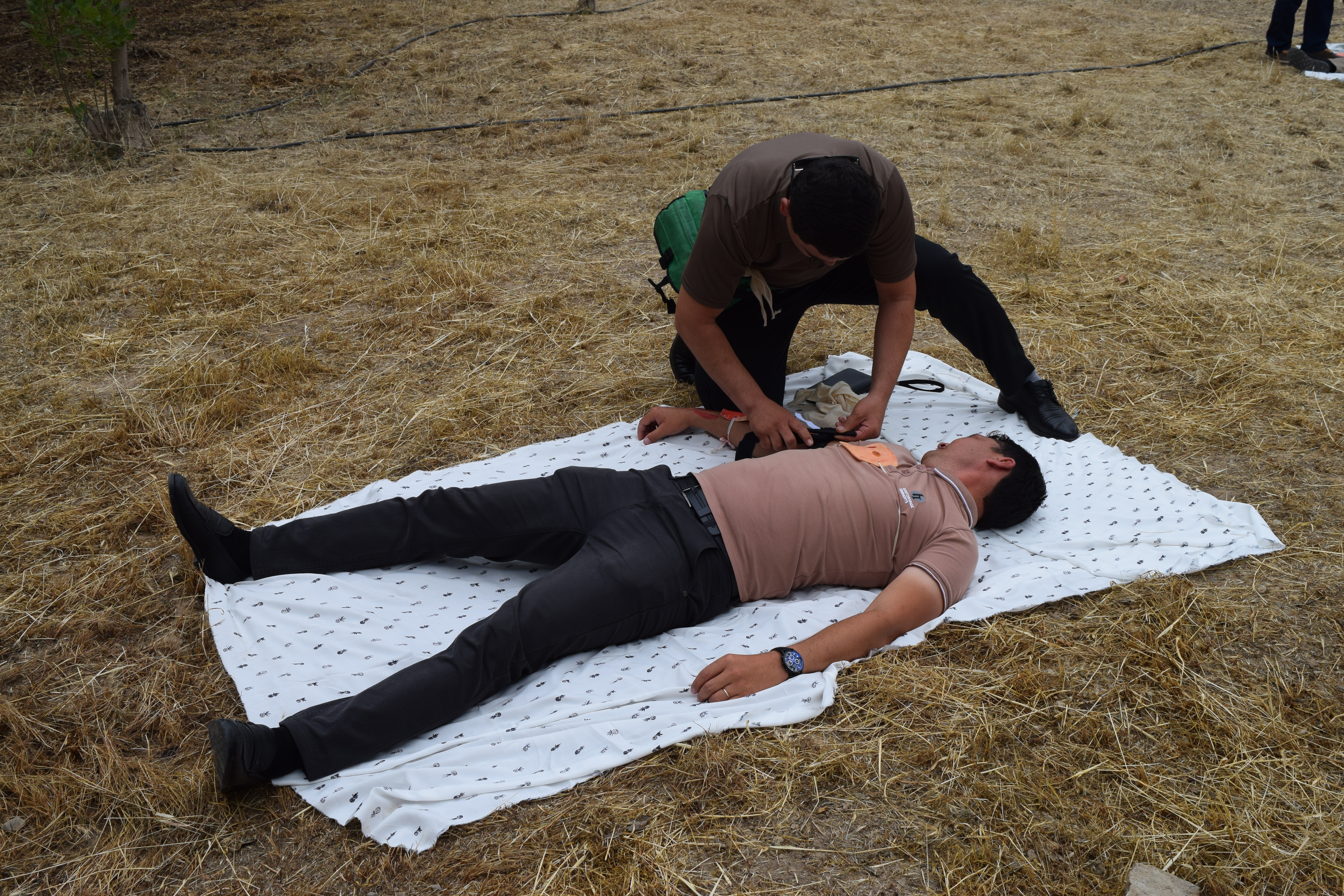 Participants during a practical exercise with simulation of various injuries and conditions held as part of an OSCE-organized Tactical Medical Training of Trainers Course, Ashgabat, 22 May 2025, OSCE