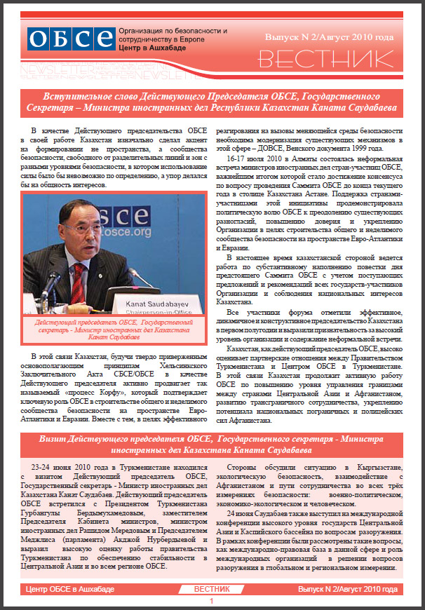 Бюллетень Центра ОБСЕ в Ашхабаде, август 2010