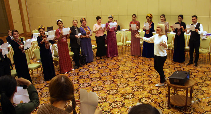 Zoia Kazanzhy (c), international trainer from Ukraine, conducts a practical exercise on planning work with target audiences as part of an OSCE organized course on press services of state institutions, Ashgabat, 18 April 2017.