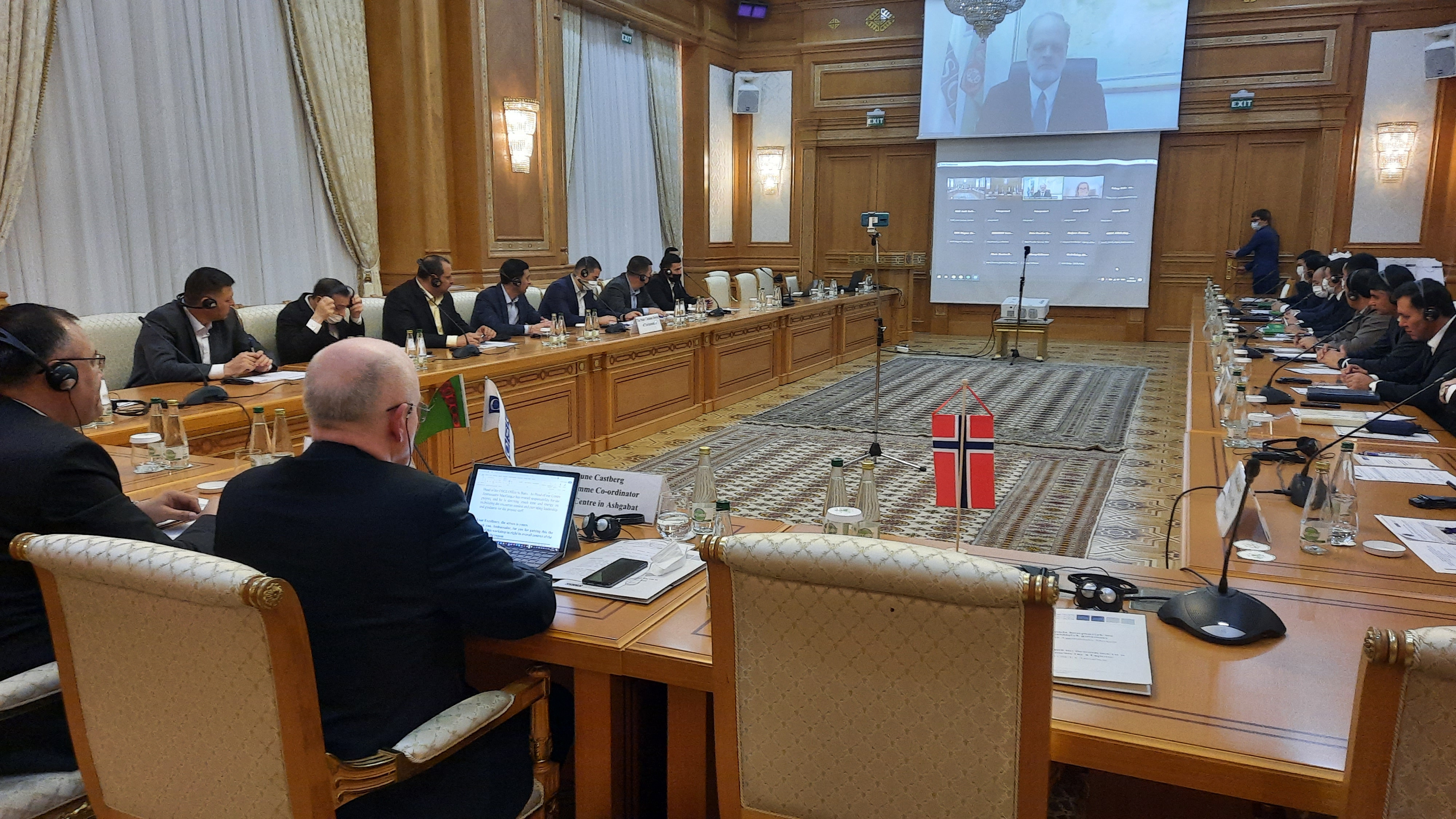 Участники семинара, проведенного в смешанном формате по гуманитарной помощи беженцам, мигрантам и внутренне перемещенным лицам, Ашхабад, 4 марта 2021 года.