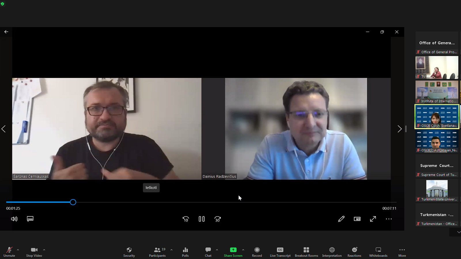 Дайнюс Раджявичюс, международный эксперт из Литвы, демонстрирует заранее записанное интервью с литовским журналистом, чтобы подчеркнуть важность права на информацию в журналистике, 27 июня 2022 года.