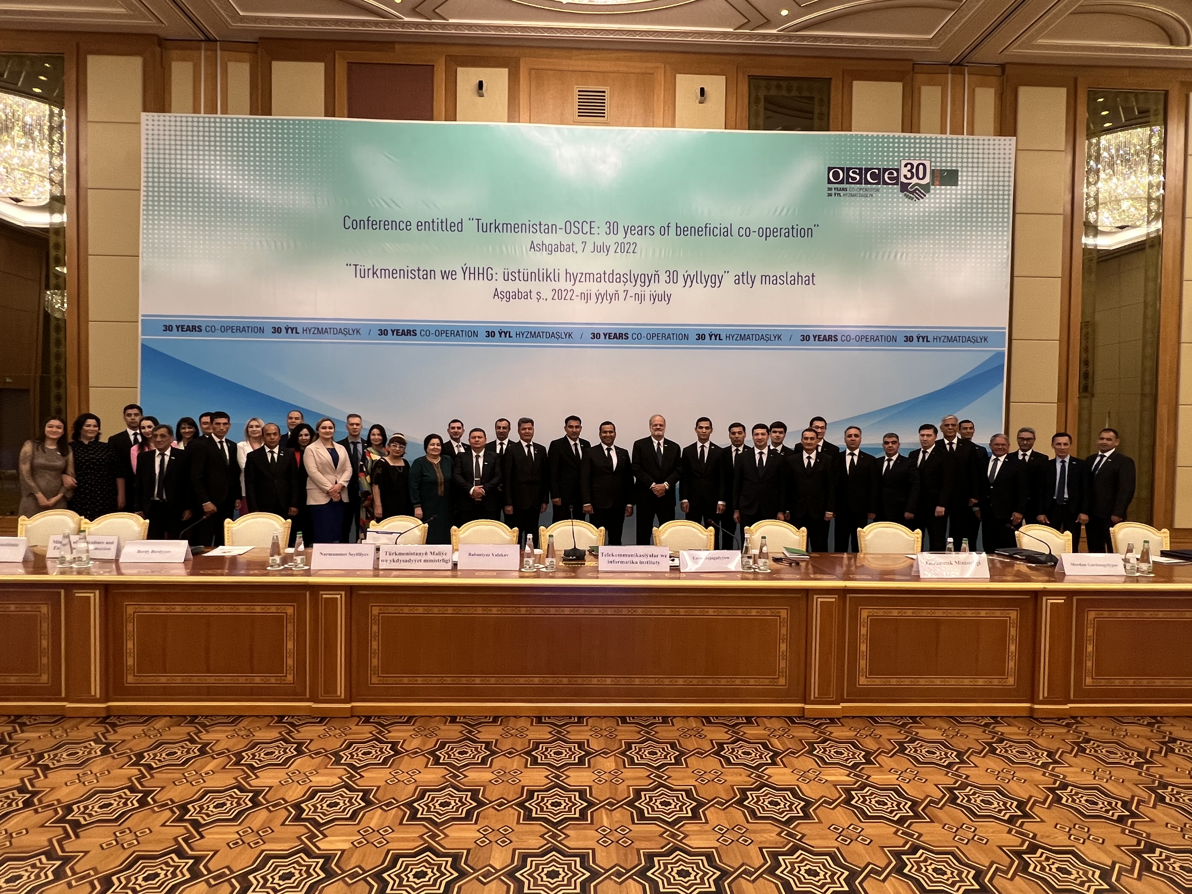 Участники конференции, посвященной 30-летию сотрудничества между ОБСЕ и Туркменистаном, состоявшейся в Ашхабаде 7 июля 2022 года.