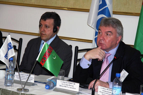 Richard Wheeler (l), OCEEA Energy Adviser and Declan Greenway, Officer-in-Charge of the OSCE Centre in Ashgabat, at an OSCE-organized workshop on energy security and diplomacy, Ashgabat, 17 March 2011.
